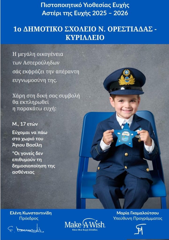 Με χαρά αναρτούμε το Πιστοποιητικό Υιοθεσίας Ευχής για το έτος 2025-2026, το οποίο μας στάλθηκε το προηγούμενο διάστημα από το Make a Wish Ελλάδας!!